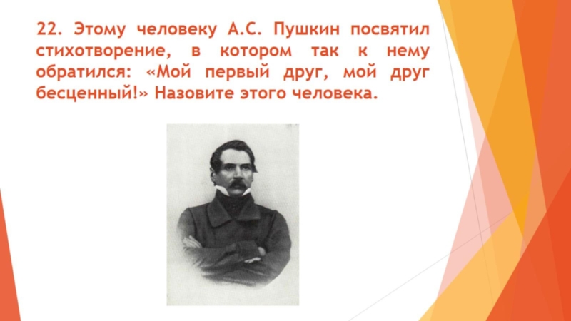 22. Этому человеку А.С. Пушкин посвятил стихотворение, в котором так к нему обратился: «Мой первый друг, мой
