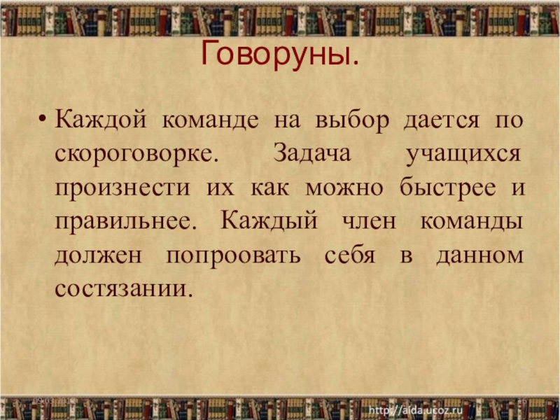 Каждой команде на выбор дается по скороговорке. Задача учащихся произнести их