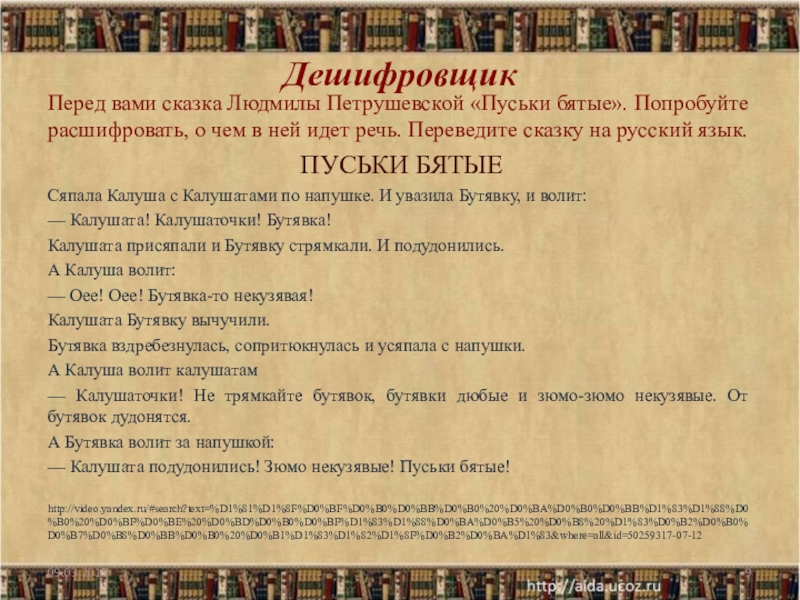 Перед вами сказка Людмилы Петрушевской «Пуськи бятые». Попробуйте расшифровать, о чем