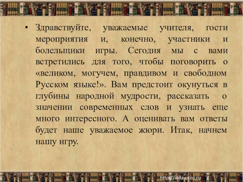 Сегодня мы с вами встретились для того, чтобы поговорить о «великом, могучем, правдивом и свободном Русском языке!». Вам предстоит окунуться в глубины народной мудрости, рассказать о значении современных слов и узнать еще много интересного. А оценивать вам ответы будет наше уважаемое жюри. Итак, начнем нашу игру.