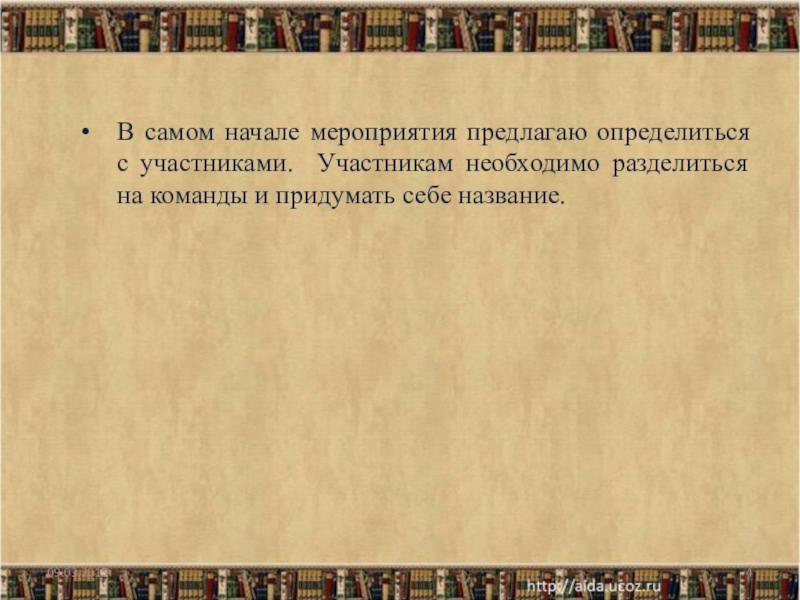 Слайд 4В самом начале мероприятия предлагаю определиться с участниками. Участникам необходимо разделиться