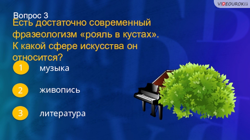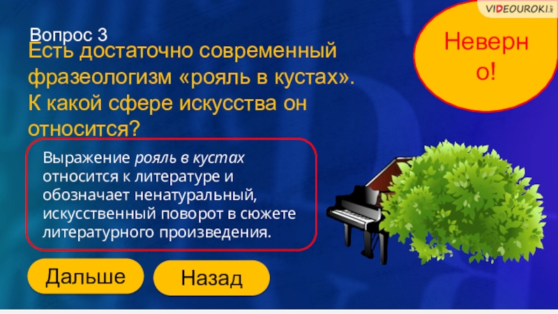 Выражение рояль в кустах относится к литературе и обозначает ненатуральный, искусственный поворот в сюжете литературного произведения.