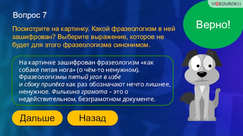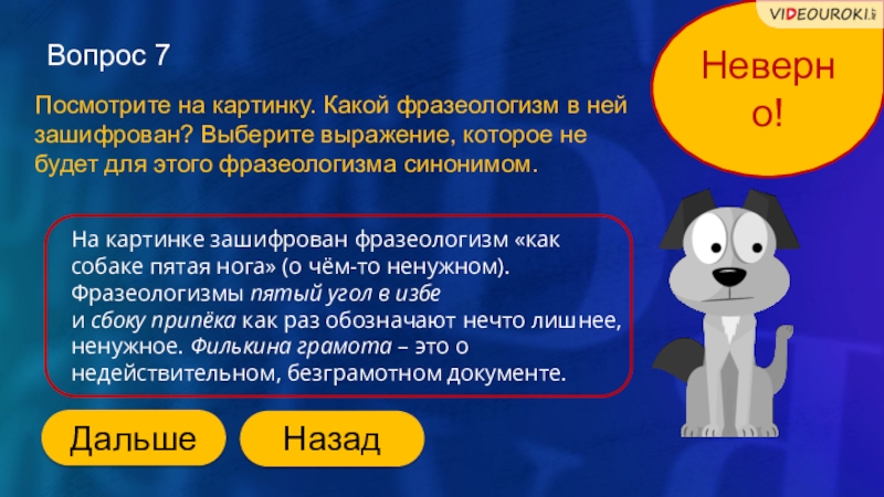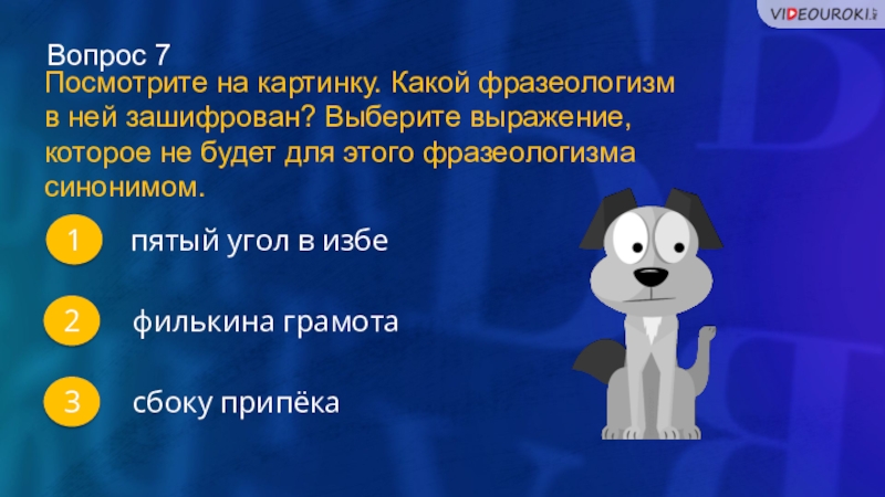 На картинке зашифрован фразеологизм «как собаке пятая нога» (о чём-то ненужном). Фразеологизмы пятый угол в избе