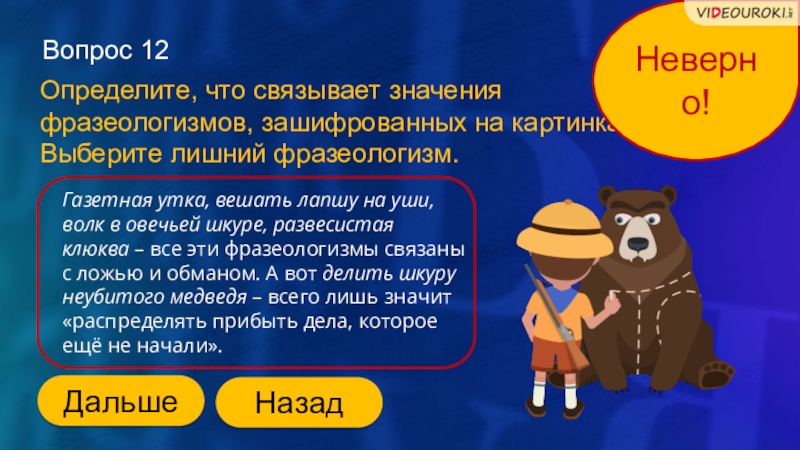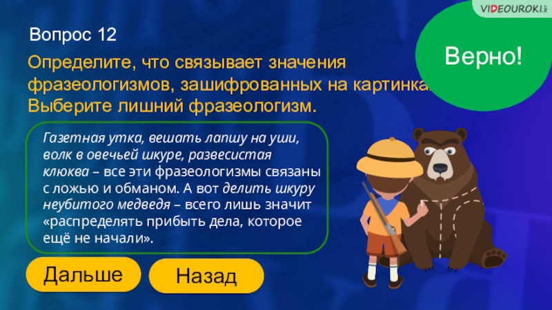 Газетная утка, вешать лапшу на уши, волк в овечьей шкуре, развесистая клюква – все эти фразеологизмы связаны с ложью и обманом. А вот делить шкуру неубитого медведя – всего лишь значит «распределять прибыть дела, которое ещё не начали».