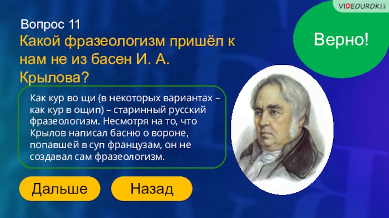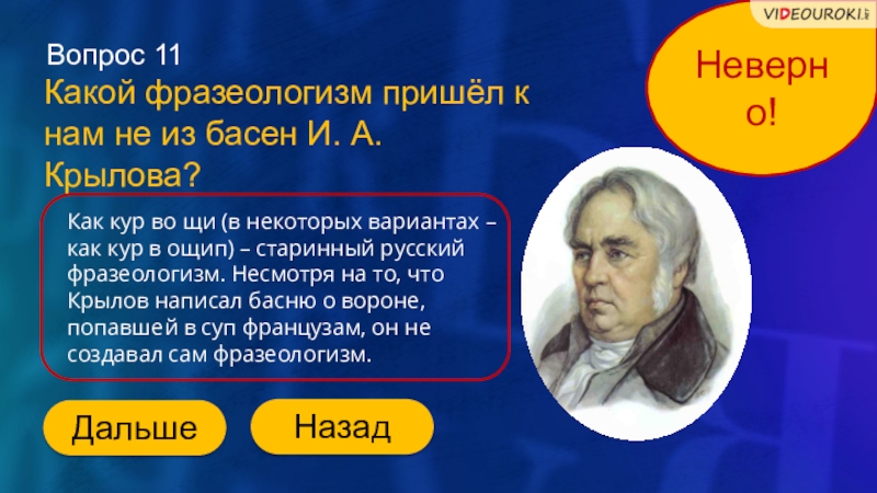 Как кур во щи (в некоторых вариантах – как кур в ощип) – старинный русский фразеологизм. Несмотря на то, что Крылов написал басню о вороне, попавшей в суп французам, он не создавал сам фразеологизм.