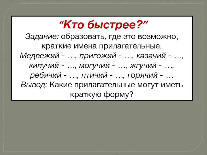 Задание: образовать, где это возможно, краткие имена прилагательные.
