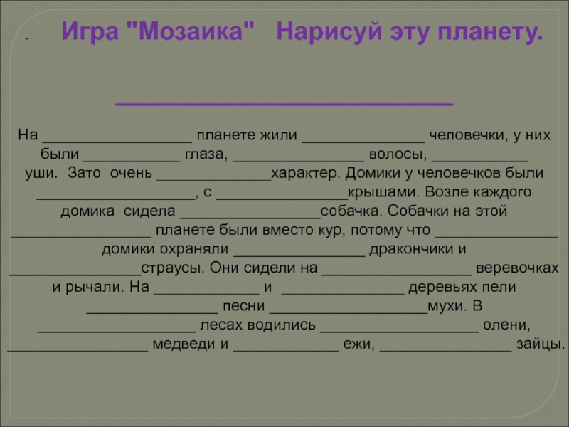 человечки, у них были ___________ глаза, _______________ волосы, ___________ уши. Зато очень _____________характер. Домики у человечков были __________________, с _______________крышами. Возле каждого домика сидела ________________собачка. Собачки на этой ________________ планете были вместо кур, потому что ______________ домики охраняли _______________ дракончики и _______________страусы. Они сидели на _________________ веревочках и рычали. На ____________ и ______________ деревьях пели _______________ песни __________________мухи. В __________________ лесах водились __________________ олени, ________________ медведи и ____________ ежи, _______________ зайцы.