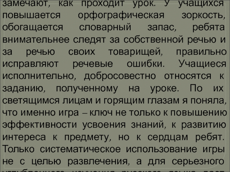 повышается орфографическая зоркость, обогащается словарный запас, ребята внимательнее следят за собственной речью и за речью своих товарищей, правильно исправляют речевые ошибки. Учащиеся исполнительно, добросовестно относятся к заданию, полученному на уроке. По их светящимся лицам и горящим глазам я поняла, что именно игра – ключ не только к повышению эффективности усвоения знаний, к развитию интереса к предмету, но к сердцам ребят. Только систематическое использование игры не с целью развлечения, а для серьезного углубленного изучения русского языка дает положительные результаты.