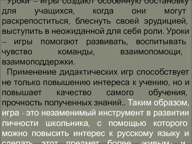 Применение дидактических игр способствует не только повышению интереса к учению, но и повышает качество самого обучения, прочность полученных знаний.. Таким образом, игра - это незаменимый инструмент в развитии личности школьника, с помощью которого можно повысить интерес к русскому языку и сделать этот предмет более «живым» и увлекательным.