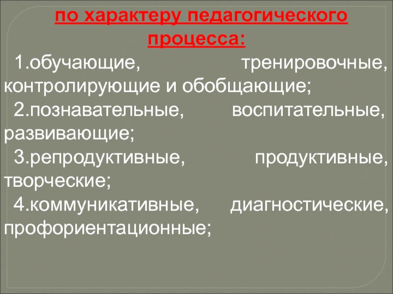 1.обучающие, тренировочные, контролирующие и обобщающие;