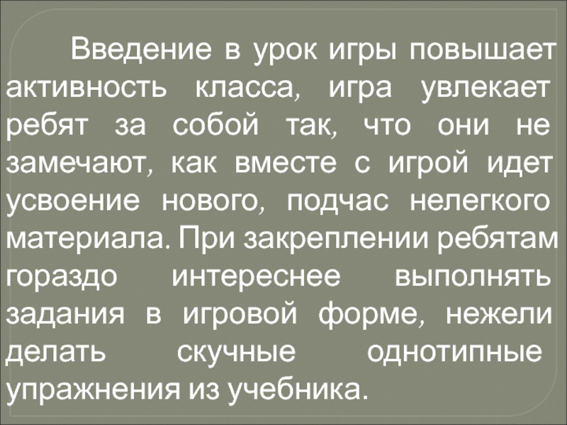 увлекает ребят за собой так, что они не замечают, как вместе с игрой идет усвоение нового, подчас нелегкого материала. При закреплении ребятам гораздо интереснее выполнять задания в игровой форме, нежели делать скучные однотипные упражнения из учебника.