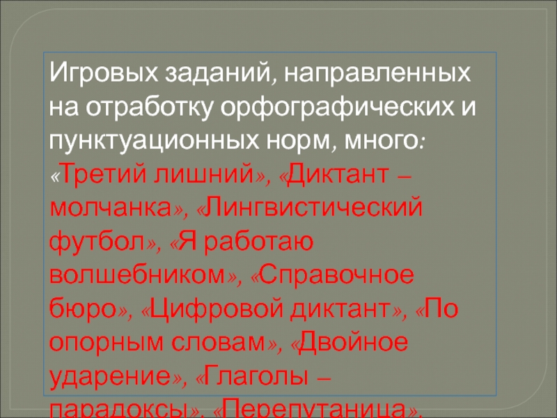Слайд 8Игровых заданий, направленных на отработку орфографических и пунктуационных норм, много: «Третий