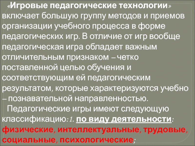 «Игровые педагогические технологии» включает большую группу методов и приемов организации