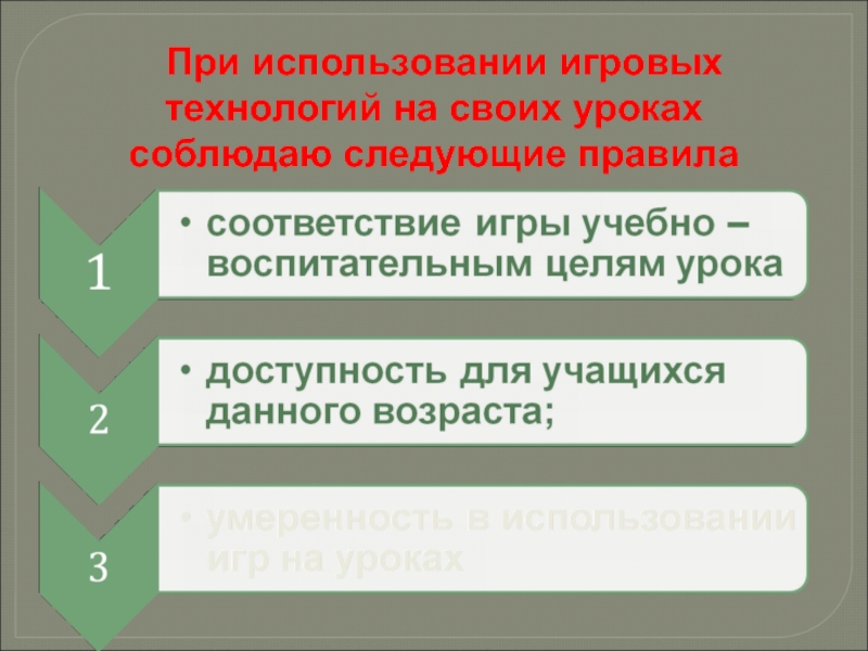 Слайд 9При использовании игровых технологий на своих уроках соблюдаю следующие правила