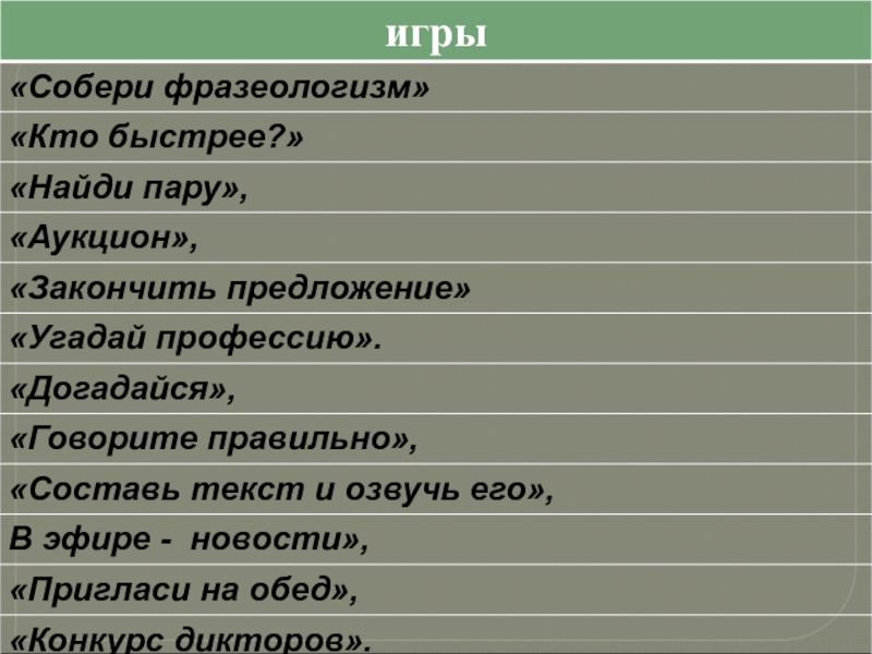лишний», «Диктант – молчанка», «Лингвистический футбол», «Я работаю волшебником», «Справочное бюро», «Цифровой диктант», «По опорным словам», «Двойное ударение», «Глаголы – парадоксы», «Перепутаница», «Лови ошибку», «Отними букву» и другие.