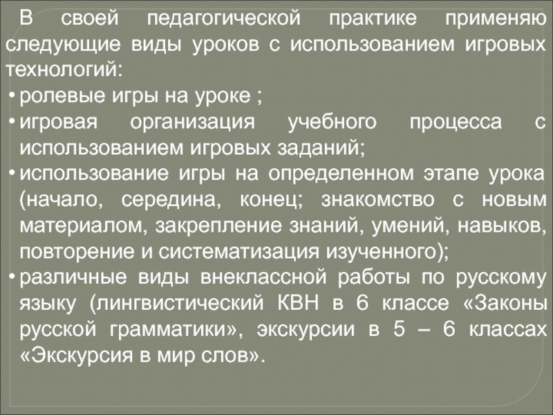 Слайд 5В своей педагогической практике применяю следующие виды уроков с использованием игровых