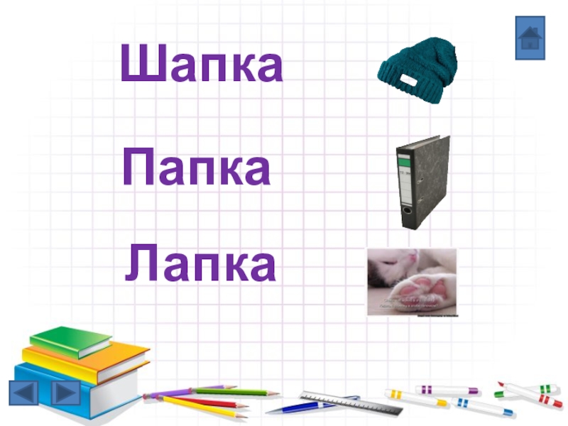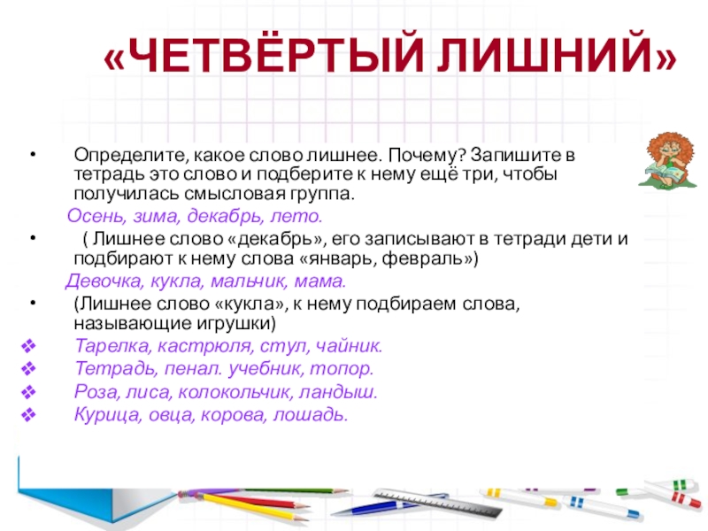( Лишнее слово «декабрь», его записывают в тетради дети и подбирают к нему слова «январь, февраль»)