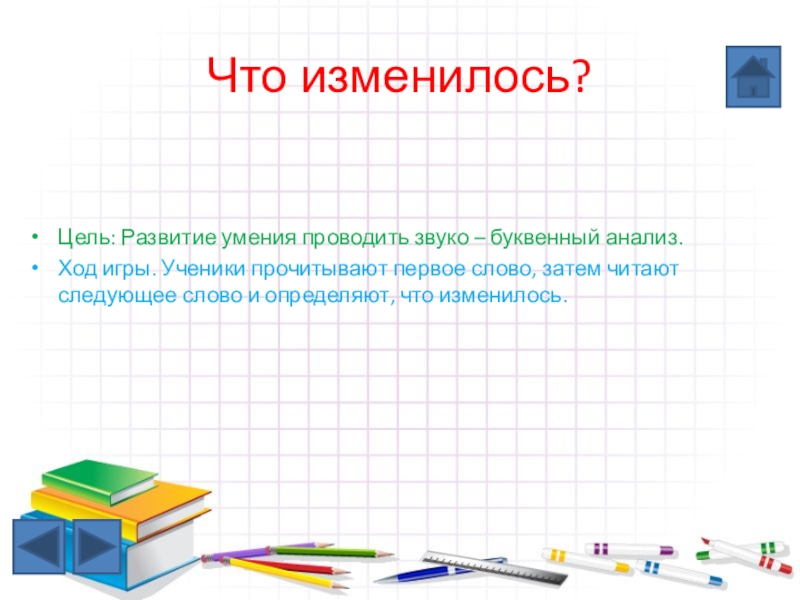 Слайд 5Цель: Развитие умения проводить звуко – буквенный анализ.