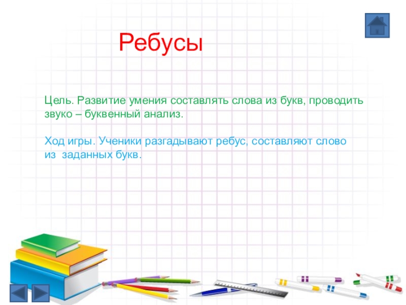 Ход игры. Ученики разгадывают ребус, составляют слово из заданных букв.