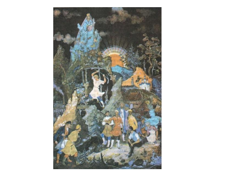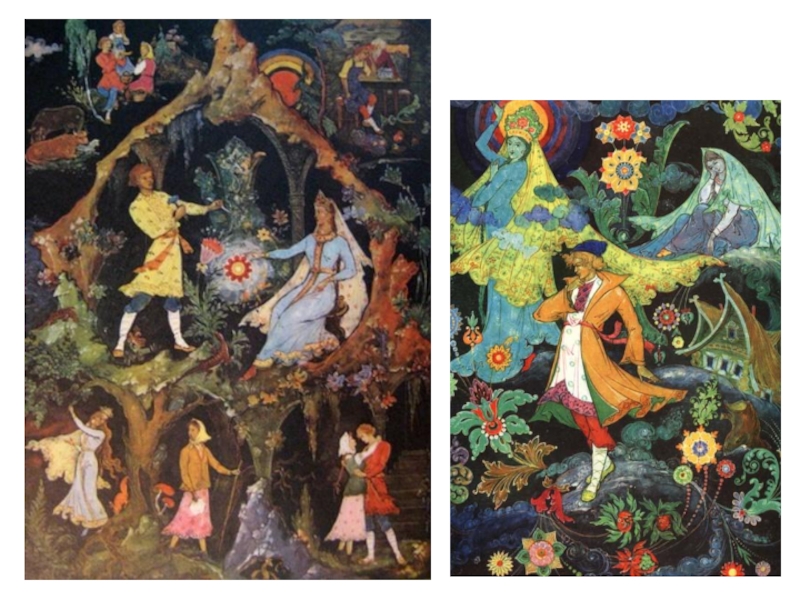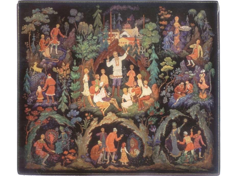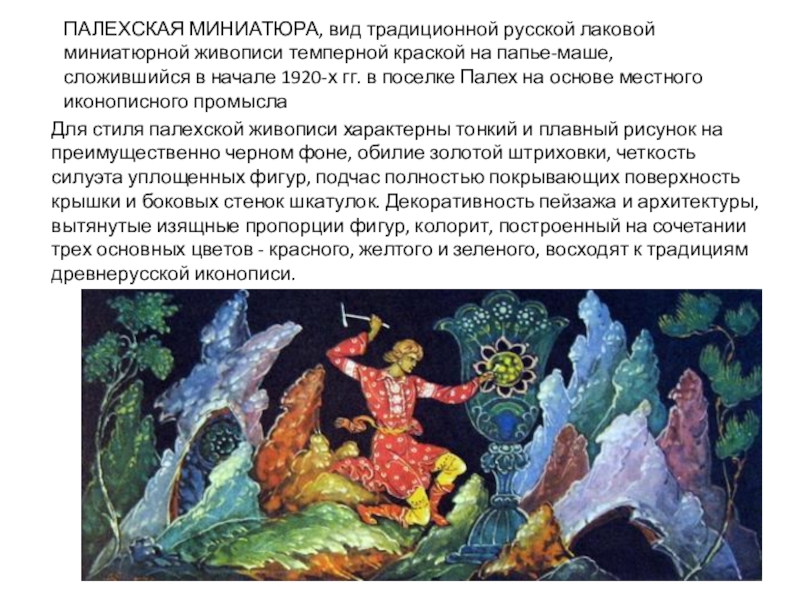 Для стиля палехской живописи характерны тонкий и плавный рисунок на преимущественно черном фоне, обилие золотой штриховки, четкость силуэта уплощенных фигур, подчас полностью покрывающих поверхность крышки и боковых стенок шкатулок. Декоративность пейзажа и архитектуры, вытянутые изящные пропорции фигур, колорит, построенный на сочетании трех основных цветов - красного, желтого и зеленого, восходят к традициям древнерусской иконописи.