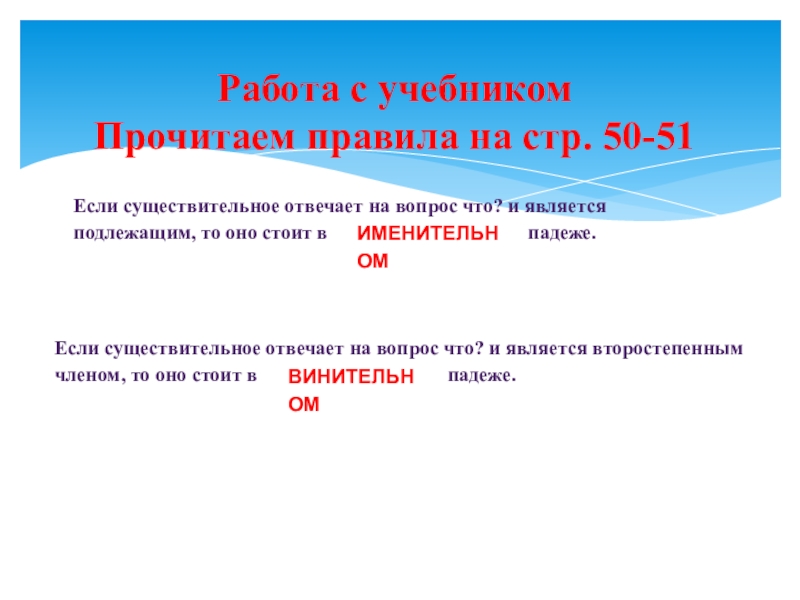 Если существительное отвечает на вопрос что? и является второстепенным членом, то оно стоит в падеже.