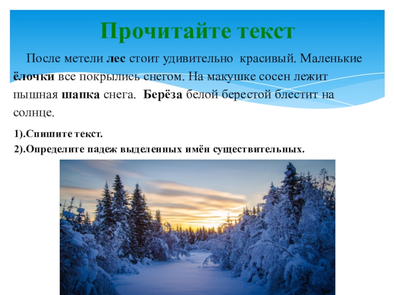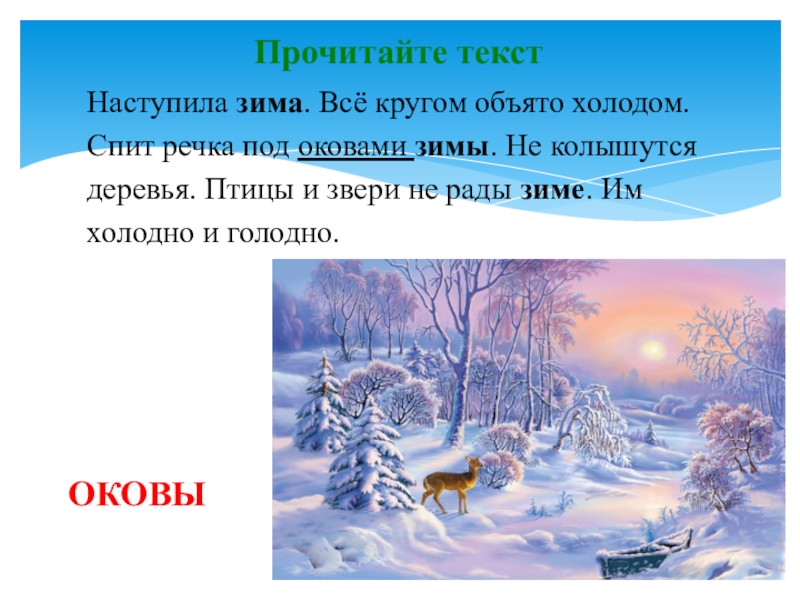 Наступила зима. Всё кругом объято холодом. Спит речка под оковами зимы. Не колышутся деревья. Птицы и звери не рады зиме. Им холодно и голодно.