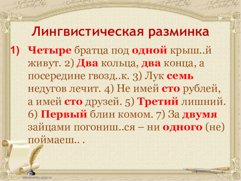 Лингвистическая разминкаЧетыре братца под одной крыш..й живут. 2) Два кольца, два конца, а посередине гвозд..к. 3)