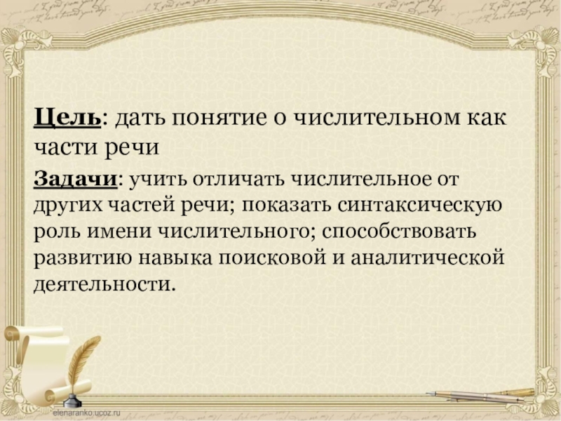 Цель: дать понятие о числительном как части речиЗадачи: учить отличать числительное от других частей речи; показать синтаксическую роль имени числительного; способствовать развитию навыка поисковой и аналитической деятельности.