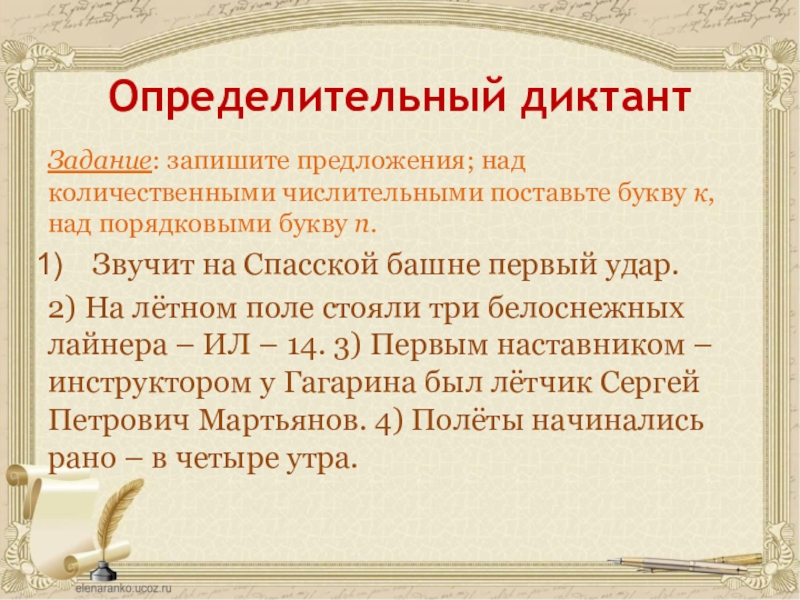 Определительный диктантЗадание: запишите предложения; над количественными числительными поставьте букву к, над порядковыми букву п.Звучит на Спасской башне