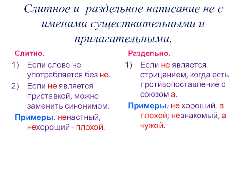 Примеры: не хороший, а плохой; незнакомый, а чужой.