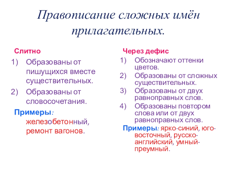 Примеры: ярко-синий, юго-восточный, русско-английский, умный-преумный.