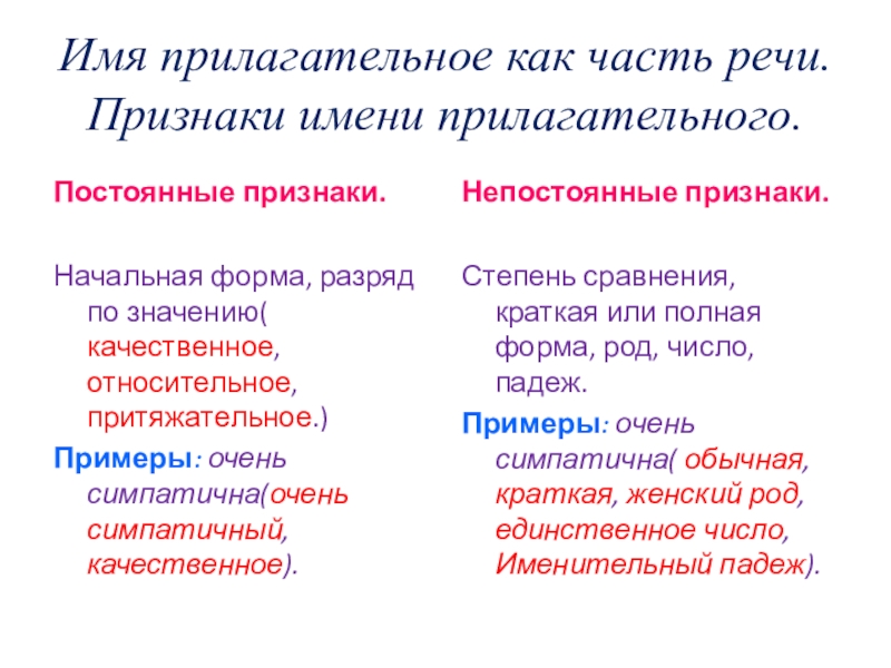 Примеры: очень симпатична( обычная, краткая, женский род, единственное число, Именительный падеж).