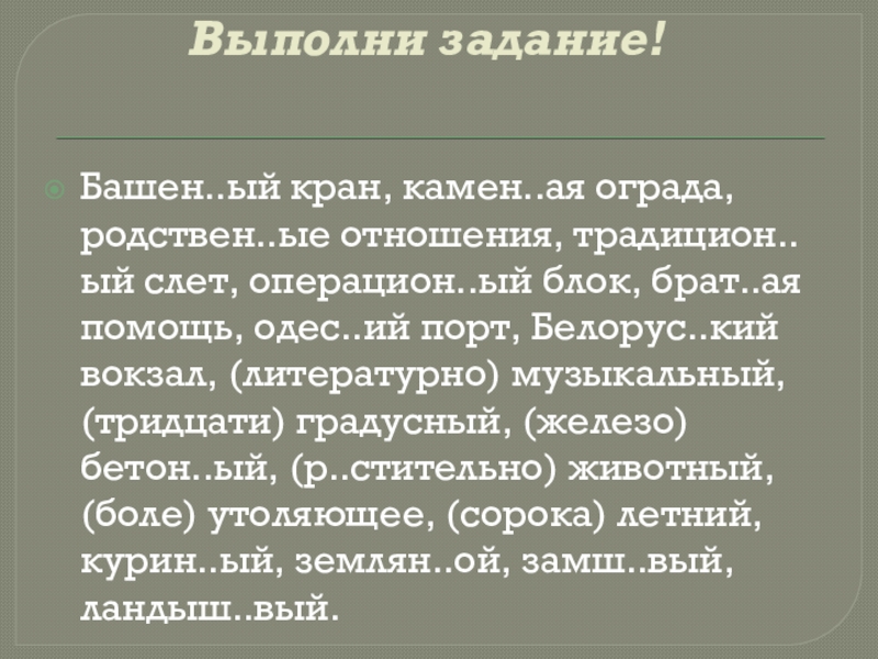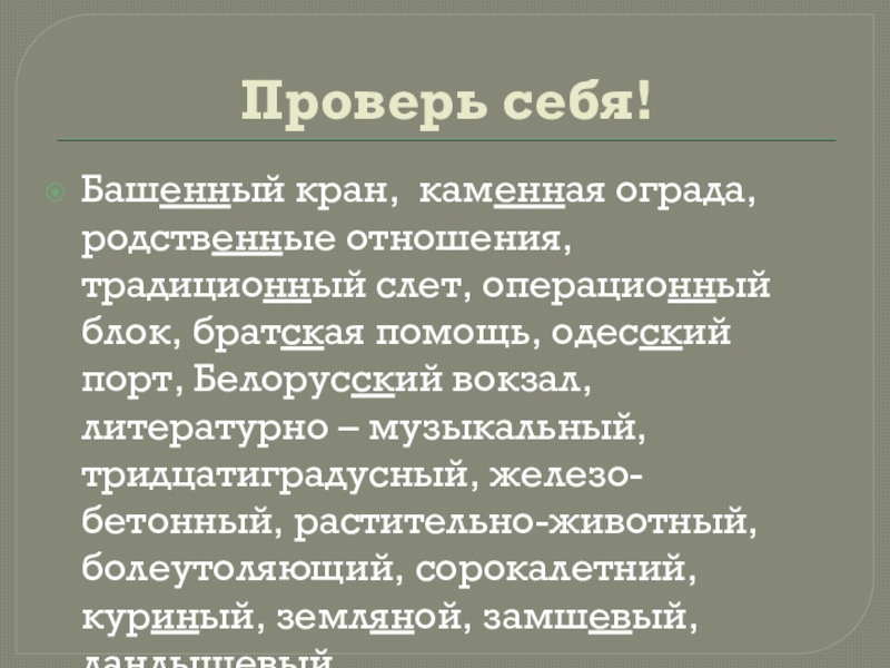 братская помощь, одесский порт, Белорусский вокзал, литературно – музыкальный, тридцатиградусный, железо- бетонный, растительно-животный, болеутоляющий, сорокалетний, куриный, земляной, замшевый, ландышевый.
