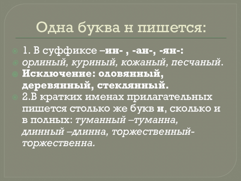 2.В кратких именах прилагательных пишется столько же букв н, сколько и в полных: туманный –туманна, длинный –длинна, торжественный- торжественна.