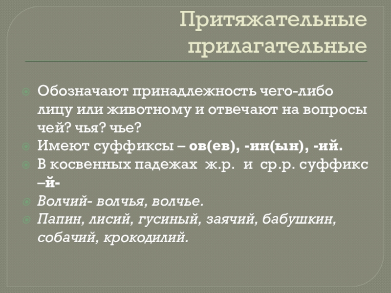 Имеют суффиксы – ов(ев), -ин(ын), -ий.