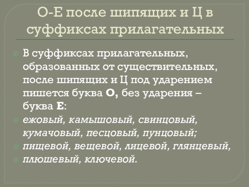 Слайд 16О-Е после шипящих и Ц в суффиксах прилагательных