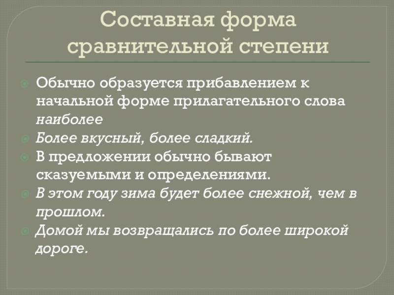 Составная форма представляет собой сочетание слов самый, наиболее с начальной (исходной) формой прилагательного.