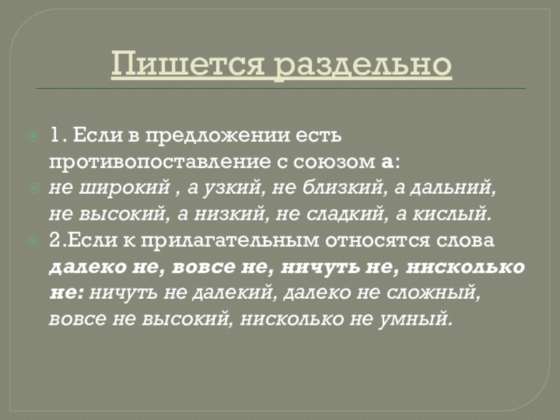 2.Если к прилагательным относятся слова далеко не, вовсе не, ничуть не, нисколько не: ничуть не далекий, далеко не сложный, вовсе не высокий, нисколько не умный.