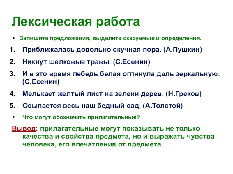 Вывод: прилагательные могут показывать не только качества и свойства предмета, но и выражать чувства человека, его впечатления от предмета.