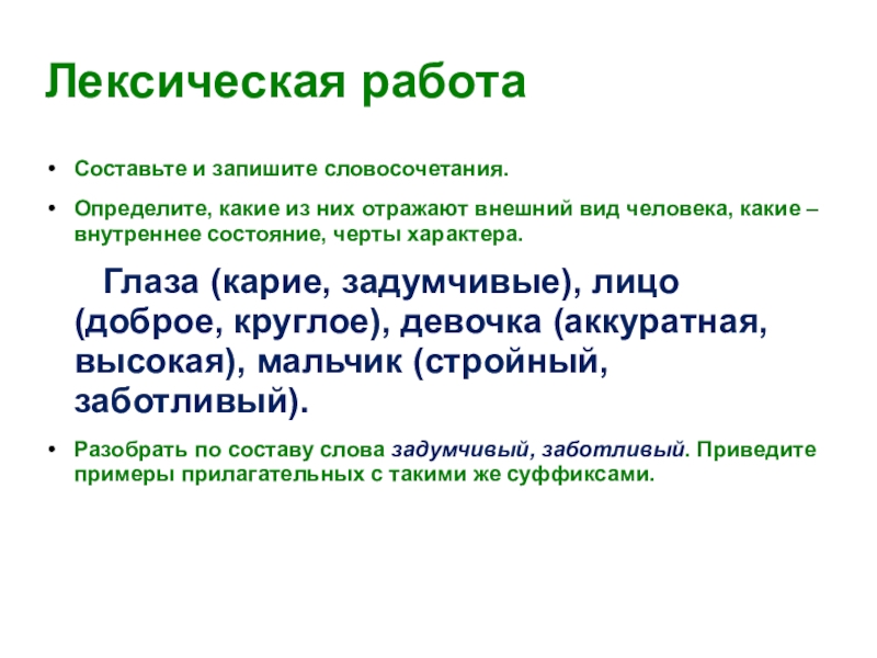 Глаза (карие, задумчивые), лицо (доброе, круглое), девочка (аккуратная, высокая), мальчик (стройный, заботливый).