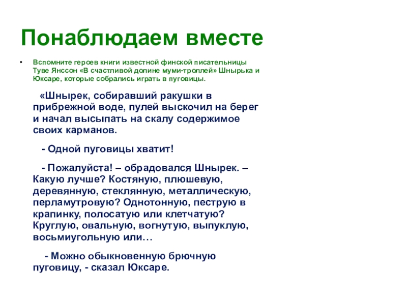 долине муми-троллей» Шнырька и Юксаре, которые собрались играть в пуговицы.