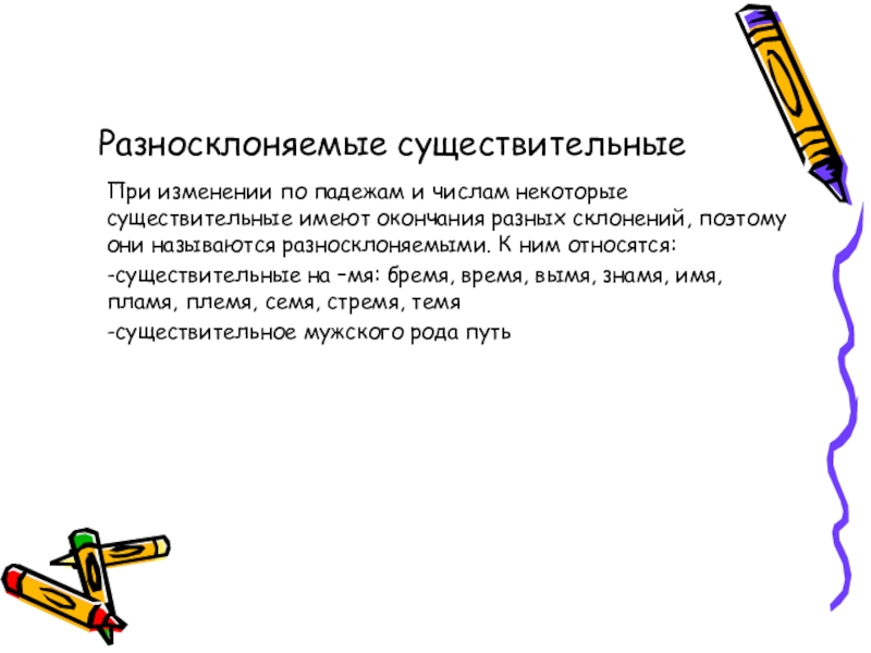 существительные имеют окончания разных склонений, поэтому они называются разносклоняемыми. К ним относятся: