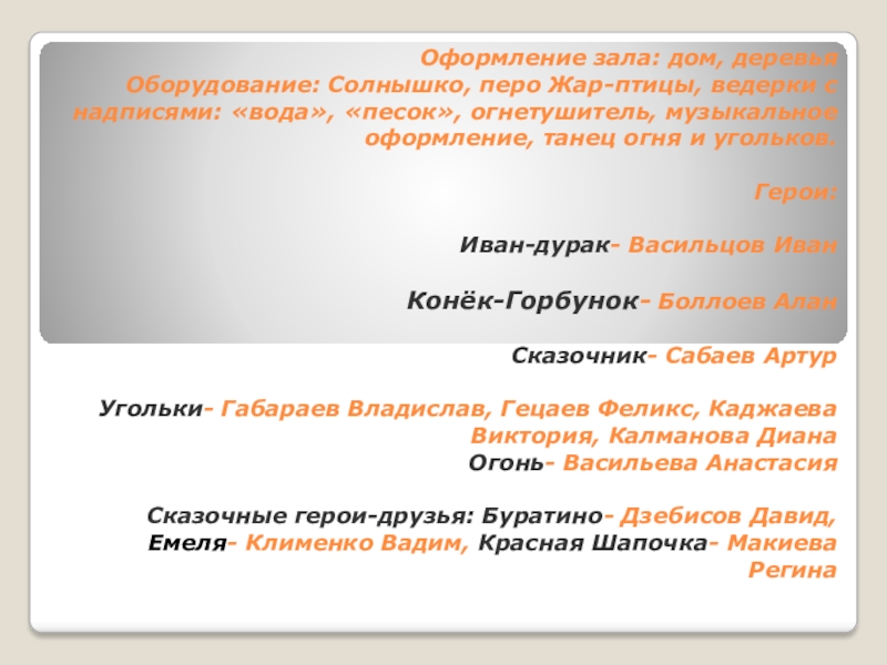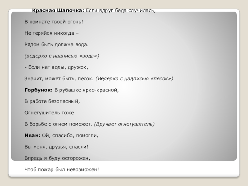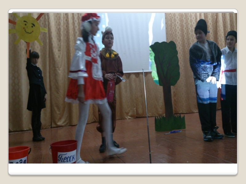 Оборудование: Солнышко, перо Жар-птицы, ведерки с надписями: «вода», «песок», огнетушитель,