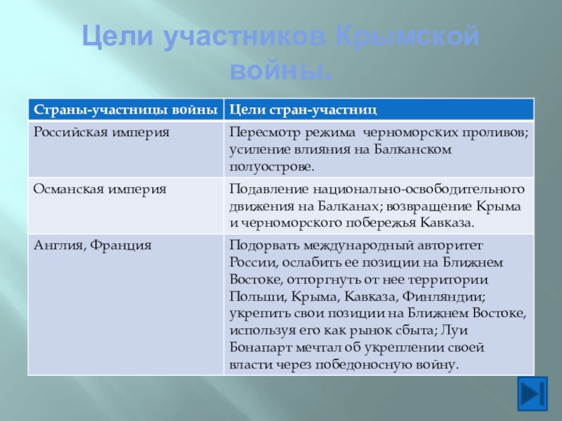 Слайд 6Цели участников Крымской войны.