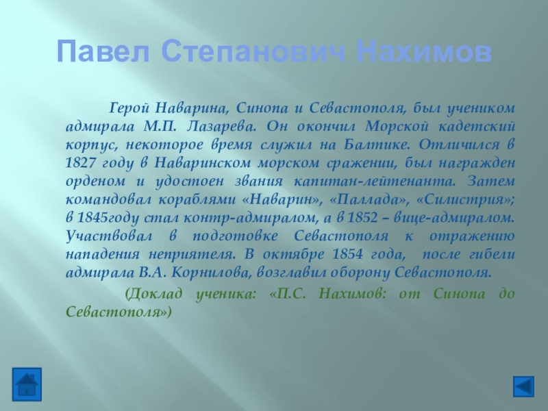 (Доклад ученика: «П.С. Нахимов: от Синопа до Севастополя»)