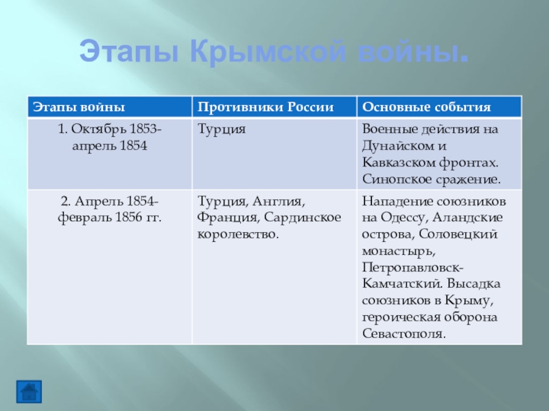 4. Таблицы: «Цели участников Крымской войны», «Этапы войны», «Условия Парижского мирного договора и его результаты для России».