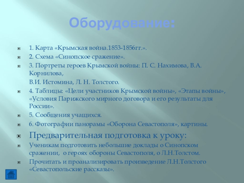 Ученикам подготовить небольшие доклады о Синопском сражении, о героях обороны Севастополя, о Л.Н.Толстом.