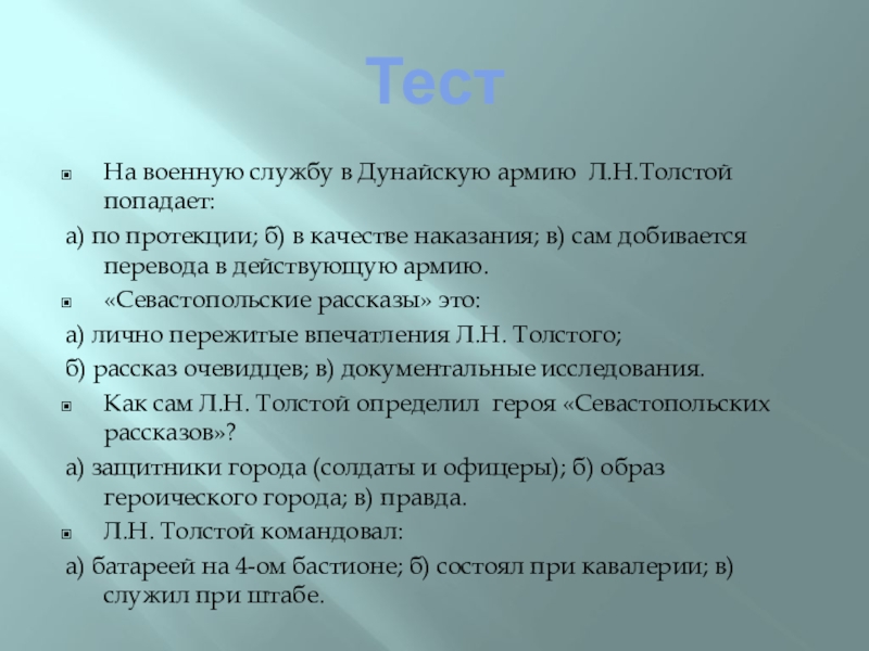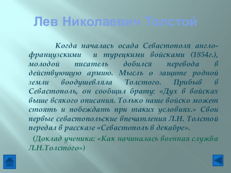 (Доклад ученика: «Как начиналась военная служба Л.Н.Толстого»)