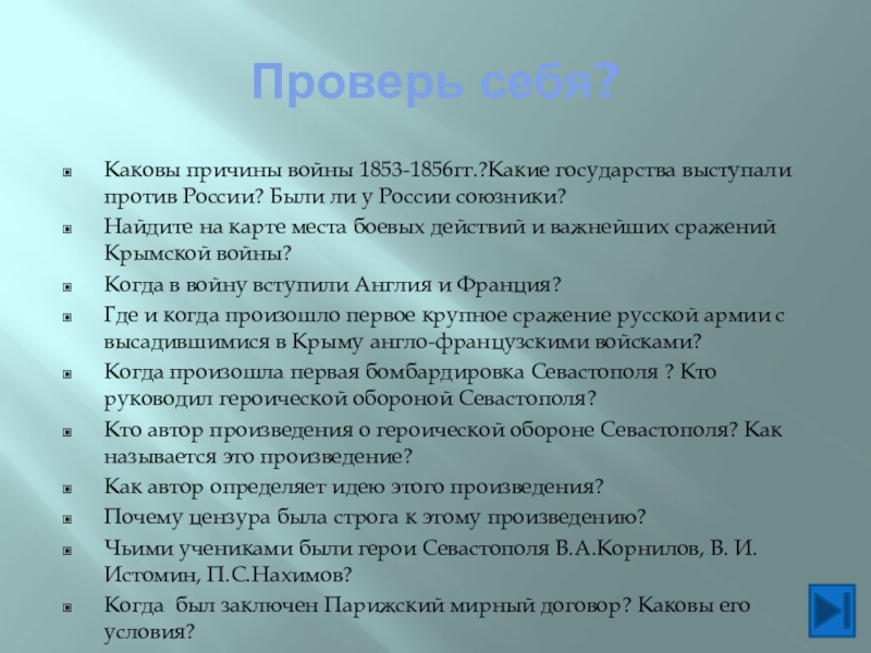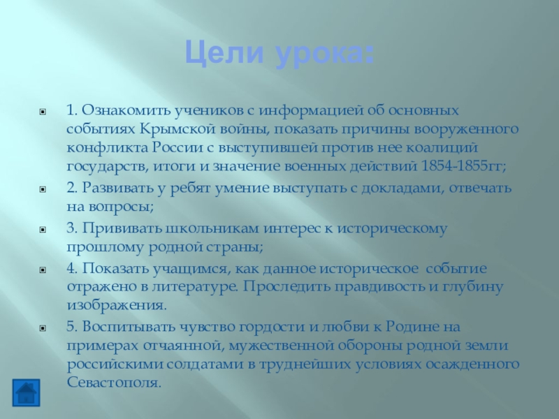 1. Ознакомить учеников с информацией об основных событиях Крымской войны,