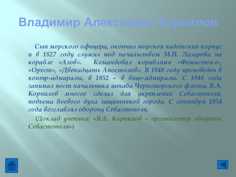 (Доклад ученика: «В.А. Корнилов – организатор обороны Севастополя»)